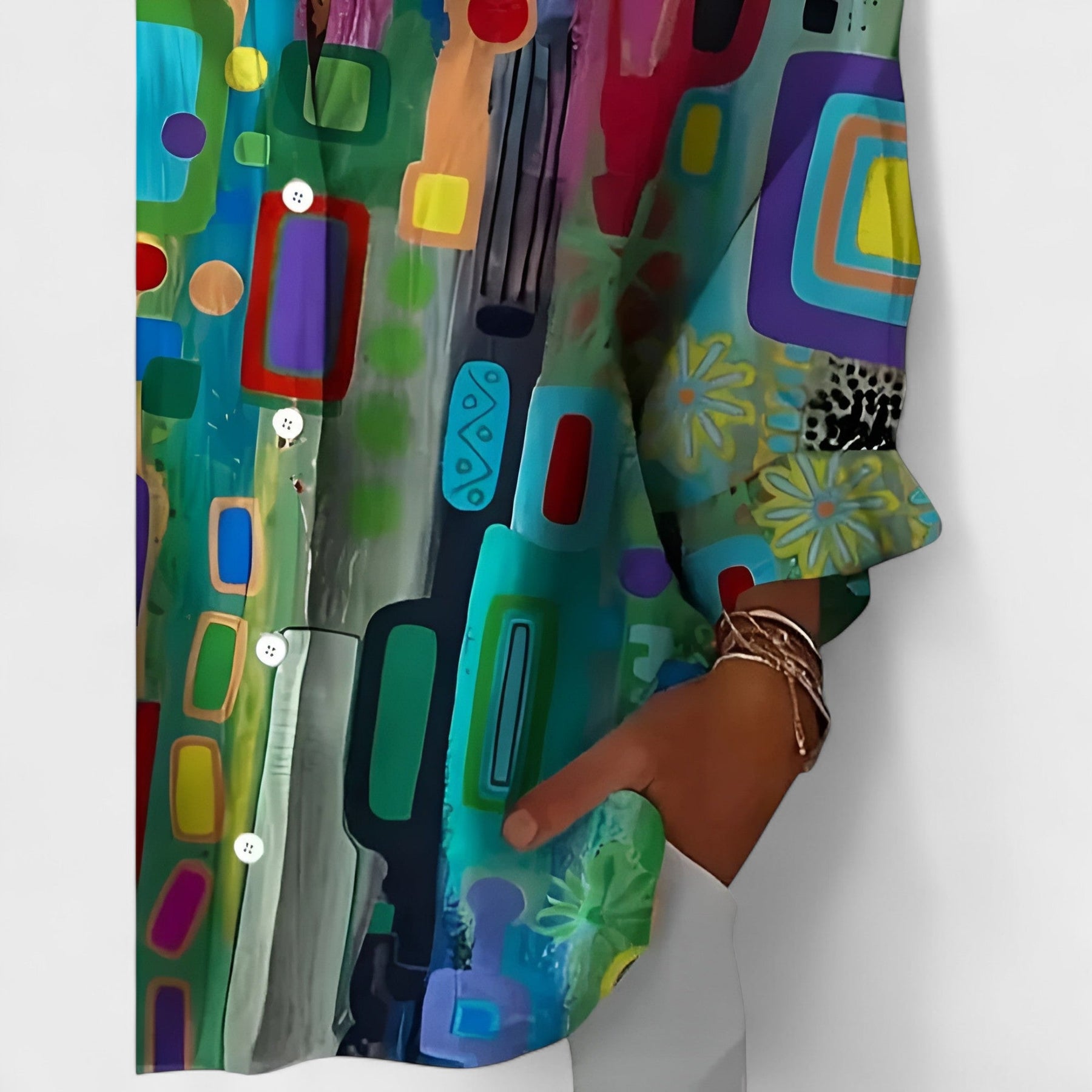 Este vestido maxi de inspiração boémia é uma verdadeira obra de arte em tecido. Com um corte solto e fluido, é feito para oferecer liberdade e frescura em cada movimento. O padrão vibrante em blocos de cor e riscas assimétricas transforma cada saída numa afirmação de estilo e individualidade. Ideal para dias de verão, passeios à beira-mar ou encontros descontraídos, este vestido combina ousadia, leveza e um toque artístico que não passa despercebido.